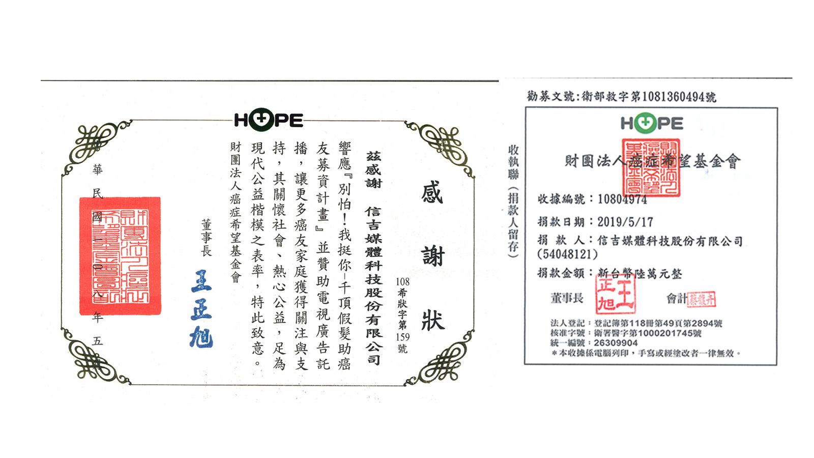 捐贈對象:響應『別怕!我挺你!千頂假髮助癌友募資計畫』並贊助電視廣告託播+捐款陸萬元整